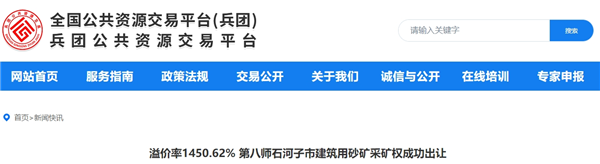 5月13日,新疆生產建設兵團第八師石河子市143團砂石土集中開采區建筑用砂礦采礦權成功出讓。該礦起始價361.34萬元,經過53輪現場激烈競價,最終以成交價5602萬元順利出讓,溢價率高達1450.62%,創下了師市礦業權交易價格的新紀錄。