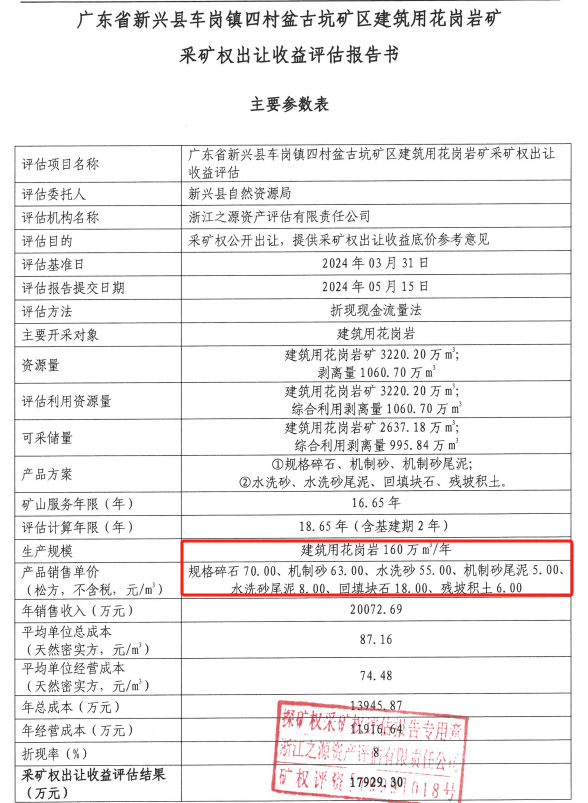 據獲悉,廣東省新興縣車崗鎮四村盆古坑礦區建筑用花崗巖礦采礦權出讓收益評估報告公示,礦區范圍內建筑用花崗巖礦礦石查明資源量3220.2萬方,可采儲量2637.18萬方,年產160萬方,采礦權出讓收益評估結果為人民幣1.79億元。
