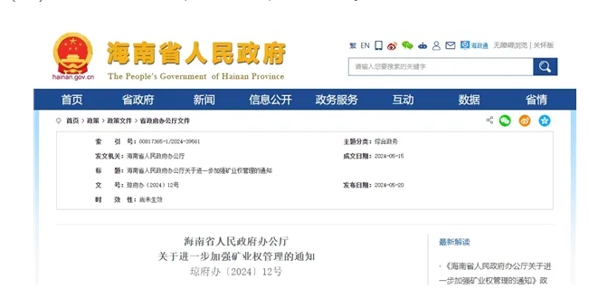 5月20日,海南省人民政府發布了全新修訂的《海南省人民政府辦公廳關于進一步加強礦業權管理的通知》(簡稱“《通知》”)。《通知》自2024年6月18日起施行,有效期3年。