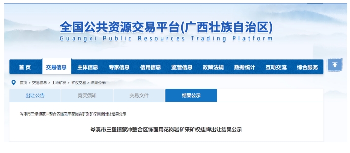 2024年5月22日,廣西恒云星石材有限公司以5.18億元競得岑溪市三堡鎮蒙沖整合區飾面用花崗巖礦。礦區建筑石料(荒料余料)8946.43 萬立方米+建筑石料用花崗巖礦礦石量6591.77萬立方米(17665.94萬噸)共計1.56億方,年產砂石630萬噸。