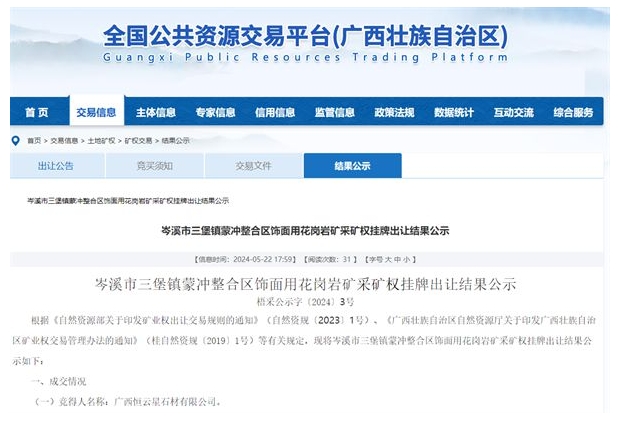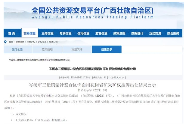 廣西恒云星石材有限公司以底價5.18億元(51890萬元)競得該項目礦權。