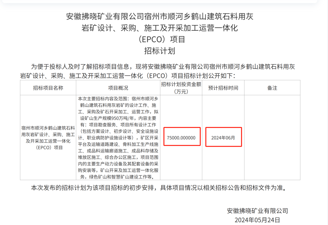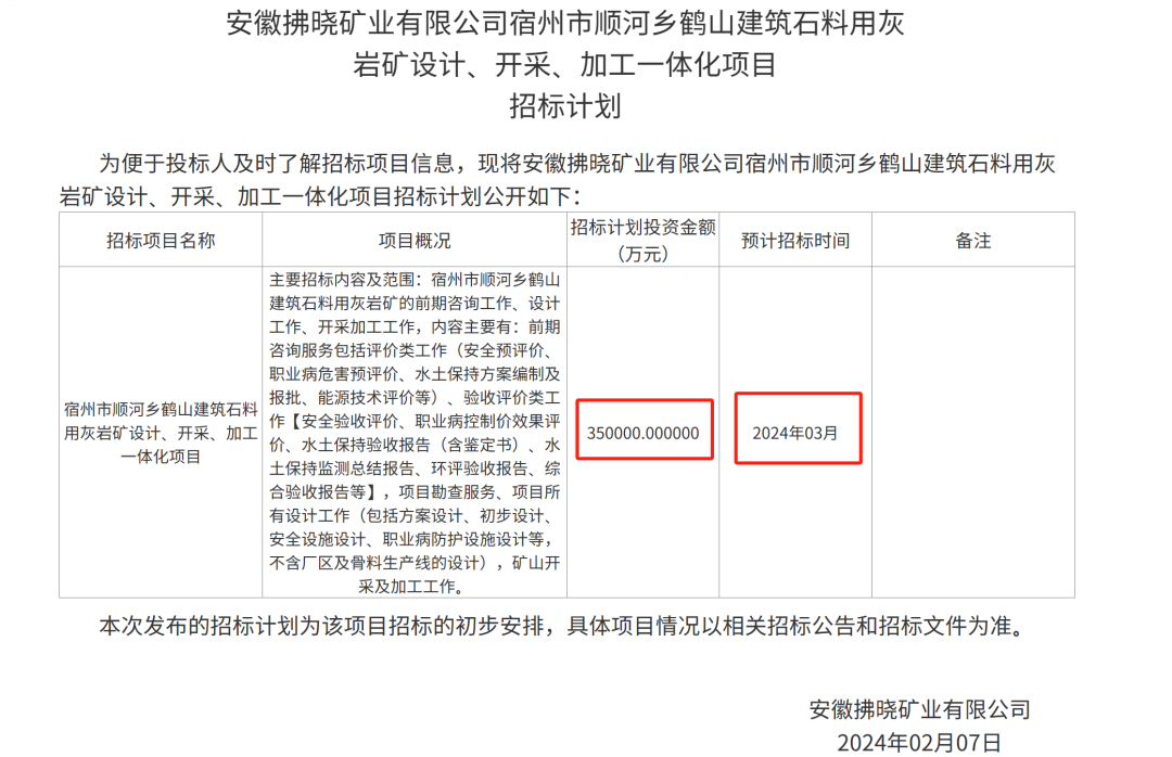據了解,2024年2月,就曾發布宿州市順河鄉鶴山建筑石料用灰巖礦設計、開采、加工一體化項目招標計劃,招標計劃投資金額為35億。招標計劃為2024年3月。