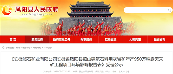 5月27日,安徽省滁州市鳳陽縣人民政府發布《安徽誠石礦業有限公司安徽省鳳陽縣燕山建筑石料用灰巖礦年產950萬噸露天采礦工程項目環境影響報告表》受理公示。