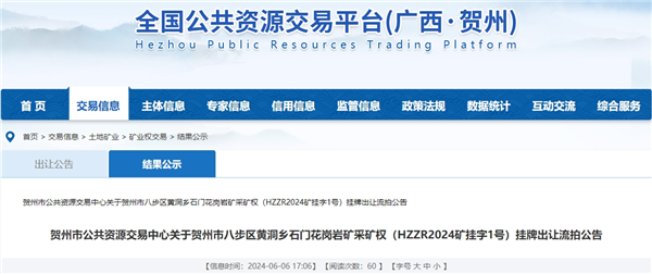 根據公告,該礦位于賀州市八步區黃洞鄉,為“凈礦”出讓,礦區面積0.9449平方公里,資源儲量超2.4億方(約6.5億噸),生產規模650萬方/年(約1755萬噸/年),出讓年限30年(基建期2.5年),起始價近12.8億元。產品方案為飾面用花崗巖、綜合回收利用建筑石料用花崗巖、建筑用砂。