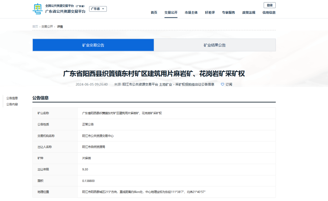 該礦權生產規模為50萬立方米/年,出讓年限為9年3個月,建筑用片麻巖礦石和建筑用花崗巖礦石資源量礦石量692.57萬立方米,出讓起始價5931萬元。
