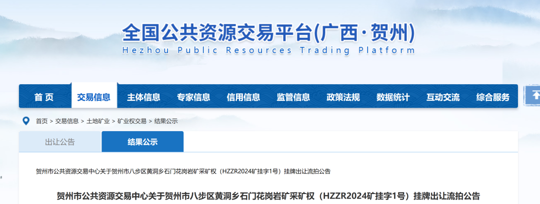 近日,廣西賀州市公共資源交易中心發布賀州市八步區黃洞鄉石門花崗巖礦采礦權(HZZR2024礦掛字1號)掛牌出讓流拍公告。該礦權礦區內累計查明花崗巖礦資源量為24090.6萬方,生產規模650萬m?/年,掛牌起始價127935萬元,單方成本約為5.3元/方。