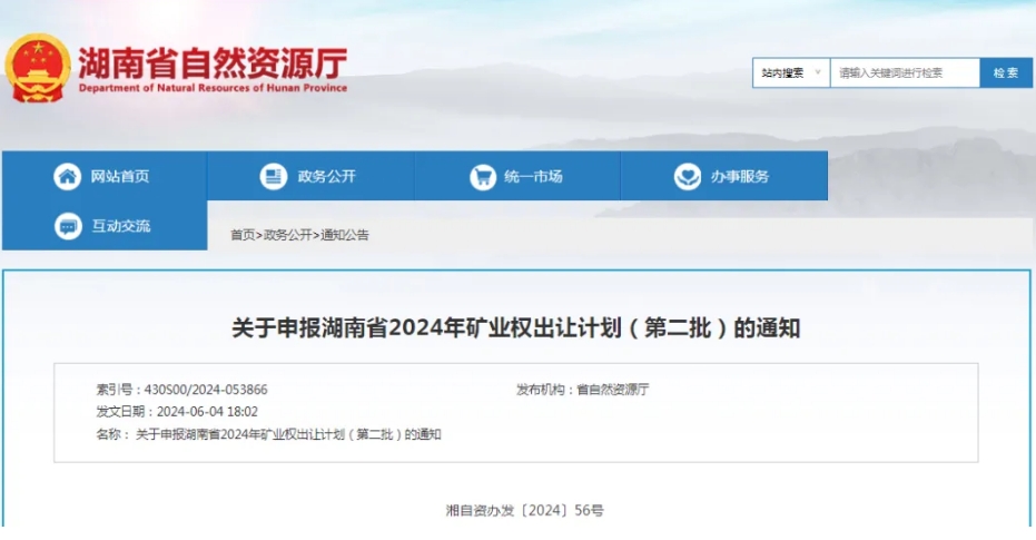 礦突破戰略行動任務,湖南省結合實際需要,發布關于申報湖南省2024年礦業權出讓計劃(第二批)的通知(以下簡稱《通知》)。