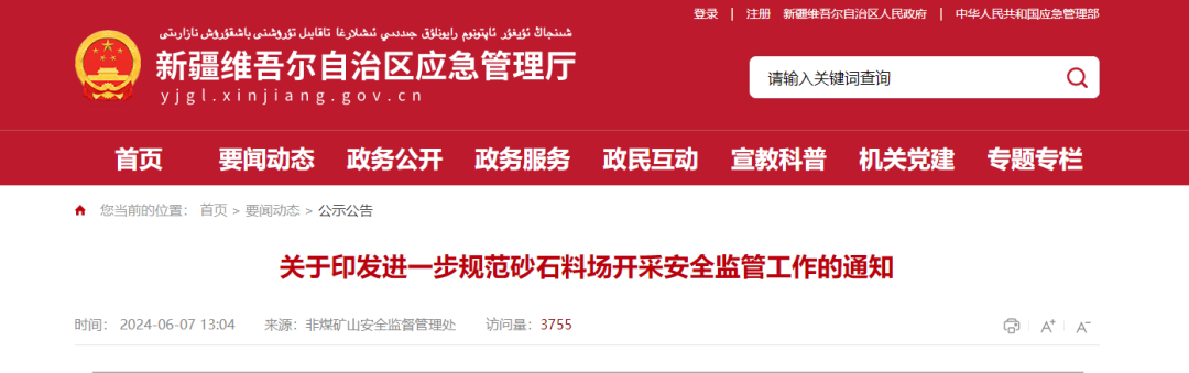 進一步規范砂石料礦安全生產行政許可和安全監管事項,壓緊壓實安全監管部門安全監管責任和企業安全生產主體責任,推動全區砂石料礦開采企業安全有序規范開采,有效遏制各類事故發生,新疆維吾爾自治區應急管理廳印發進一步規范砂石料場開采安全監管工作的通知。