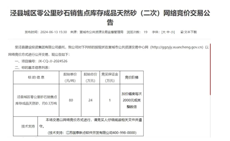 日前,安徽宣城市公共資源交易監督管理局發布涇縣城區零公里砂石銷售點庫存成品天然砂(二次)網絡競價交易公告。據悉,該項目起始單價80元/噸,總價24萬元,庫存成品約0.3萬噸。