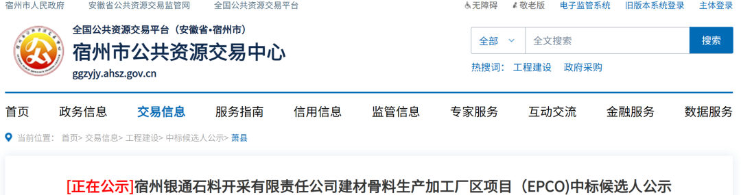 6月18日,安徽省宿州市公共資源交易中心發布宿州銀通石料開采有限責任公司建材骨料生產加工廠區項目(EPCO)中標候選人公示。第一候選人為中鐵十九局集團有限公司聯合體,聯合體成員為蘇州中材非金屬礦工業設計研究院有限公司。投標報價,建筑安裝工程費(費率)為91.6%(約2.579億元),生產承包費用綜合單價為18.7元/噸,運營期為10年。