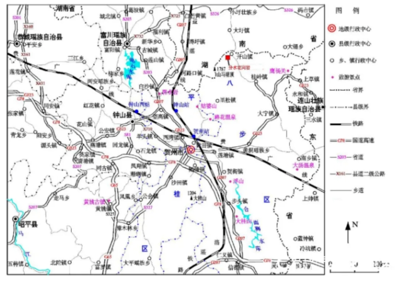 礦區(qū)位于賀州市25°方位,直距約35km處開山鎮(zhèn)分水村一帶,行政區(qū)劃隸屬賀州市八步區(qū)開山鎮(zhèn)管轄。礦區(qū)北東側(cè)有鄉(xiāng)村公路通過,由大寧鎮(zhèn)經(jīng)桂嶺鎮(zhèn)通往開山鎮(zhèn)的公路從礦區(qū)南東側(cè)通過,礦區(qū)有約3km的簡易村道與周邊鄉(xiāng)鎮(zhèn)公路相通,沿國道G323至賀州市中心約76km,交通較方便。