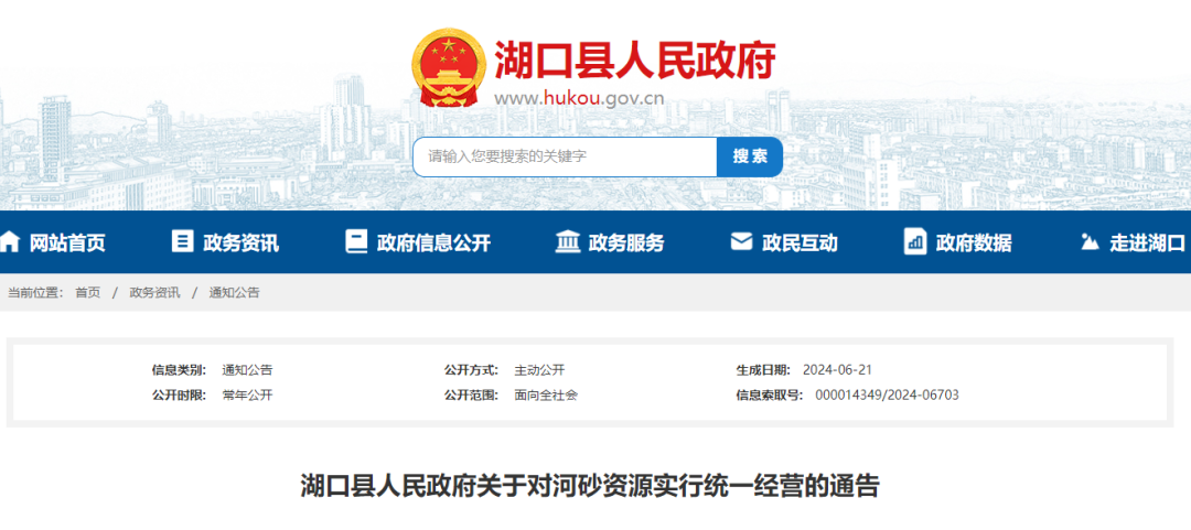 近日,江西湖口縣人民政府發布通告,表示湖口縣范圍內的河道砂石資源由縣政府確定的國有企業統一開采、統一經營、統一管理。涉及的河道砂石資源可采區批準總量為2160萬噸,年度開采控制量為100萬噸。