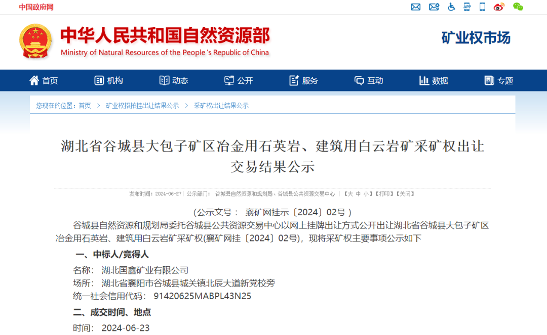 近日,湖北省谷城縣自然資源和規劃局成功出讓谷城縣大包子礦區冶金用石英巖、建筑用白云巖礦采礦權。該礦權被湖北國鑫礦業有限公司以19750 萬元成功競得,該礦區位于谷城廟灘鎮檀樹灣村,縣城南東167°方位,直線距離約20km。擬出讓開采區塊范圍內冶金用石英巖礦總資源儲量647萬噸,建筑用白云巖總資源量為25515萬噸,生產規模520萬噸/年,擬出讓年限30年,單價約為0.76元/噸。