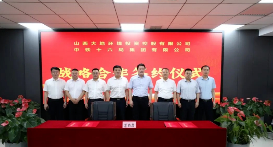 6月26日,山西大地環境投資控股有限公司(以下簡稱大地控股)黨委書記、董事長李衛平與中鐵十六局黨委副書記、總經理王紅偉舉行工作座談,雙方就深化務實合作、實現互利共贏進行深入交流,并共同見證簽約。大地控股黨委副書記、副董事長、總經理侯利強,中鐵十六局集團副總經理、總工程師楊晉文代表雙方簽署戰略合作協議。