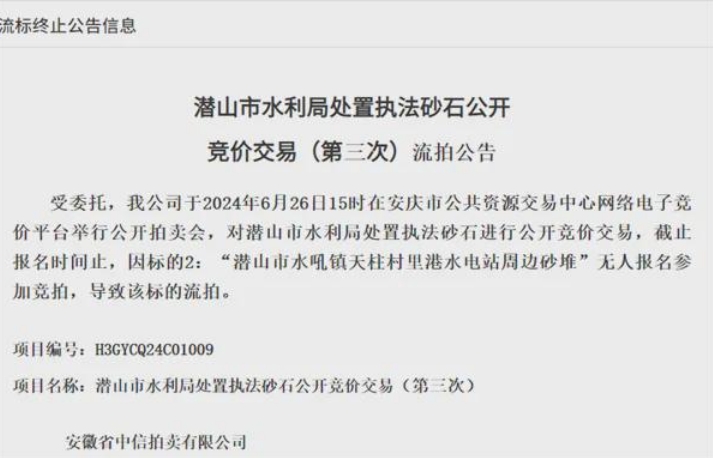 日前,安徽安慶潛山處置執法砂石因無人報名流拍。該項目資源量合計約1.65萬噸,起拍價53.45萬元,測算單價約32.5元/噸。