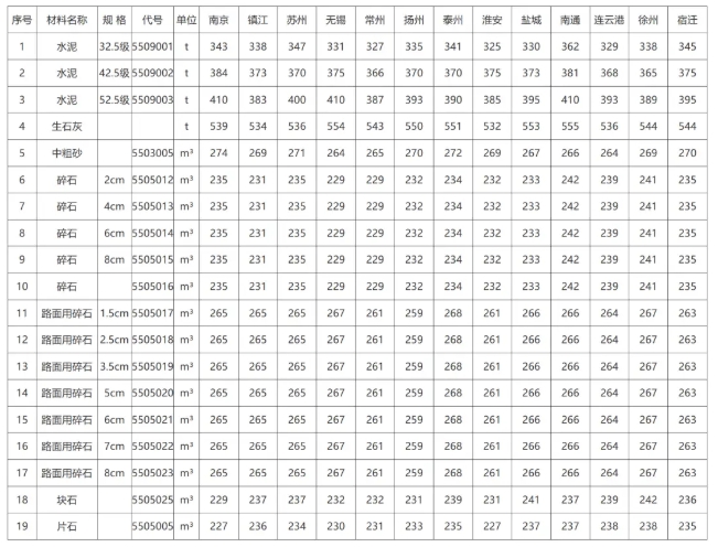 近日江蘇省交通運輸廳發布江蘇省2024年5月江蘇省各市交通建設工程主要地材指導價格(含稅價)。