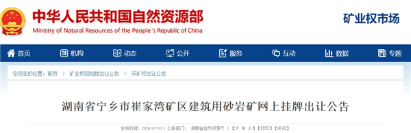 7月1日,自然資源部發布湖南省長沙市寧鄉市崔家灣礦區建筑用砂巖礦采礦權掛牌出讓公告。該礦為凈礦出讓,資源儲量破億噸,出讓年限21.5年,生產規模500萬噸/年左右,起始價5.3億元,“凈礦”出讓成本4335.33萬元,每噸成本近5.5元。