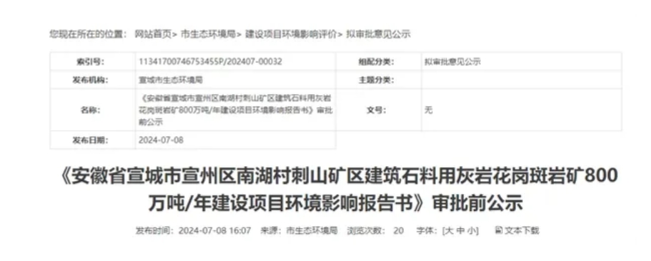 7月8日,安徽省宣城市生態環境局發布宣州區南湖村刺山礦區建筑石料用灰巖花崗斑巖礦800萬噸/年建設項目環評批前公示。