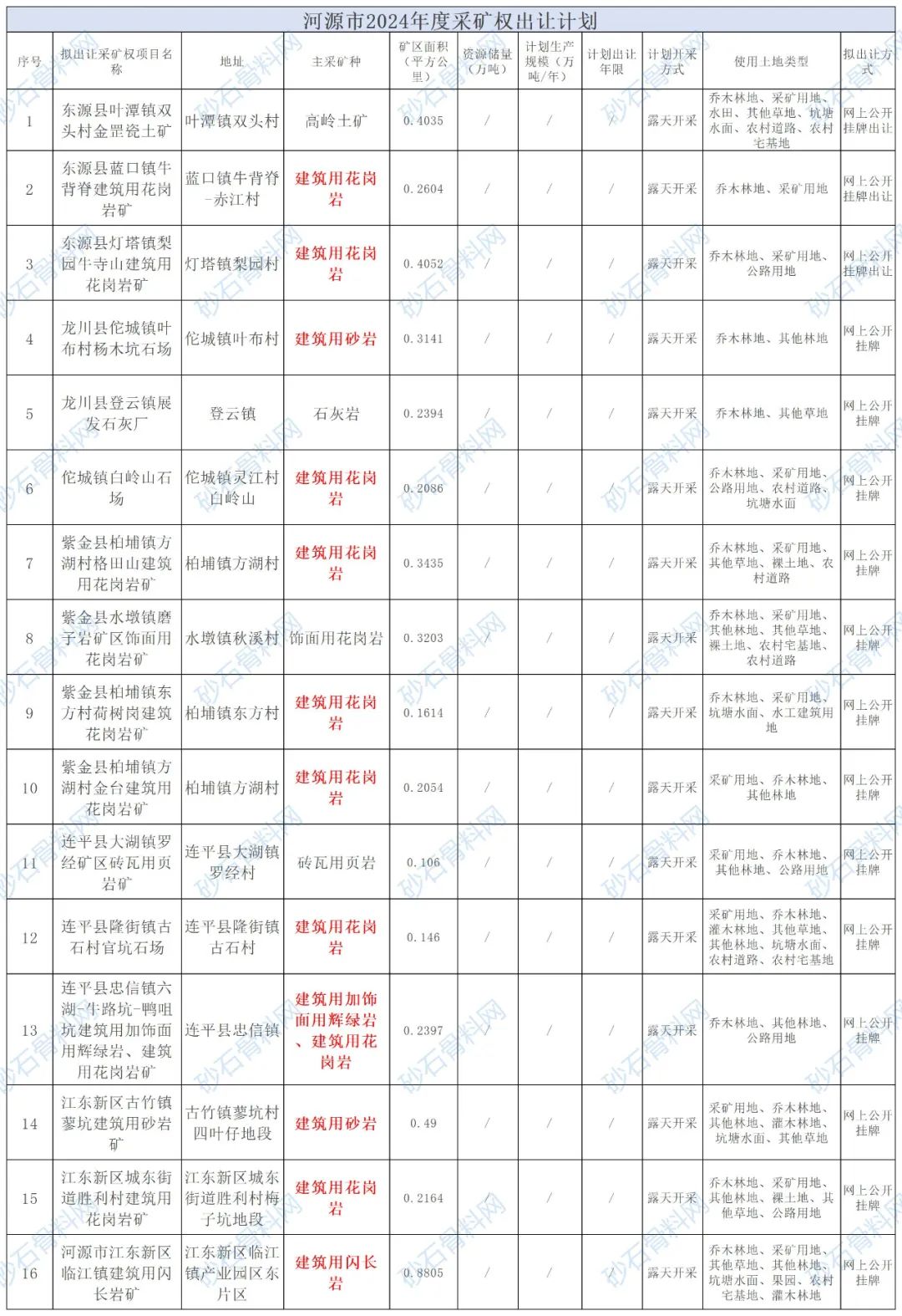 近日,廣東河源市自然資源局發布河源市2024年度采礦權出讓計劃公告,共計劃出讓礦權16宗,其中,12宗為建筑用花崗巖、閃長巖等砂石類采礦權,儲量、出讓年限等尚未公示。