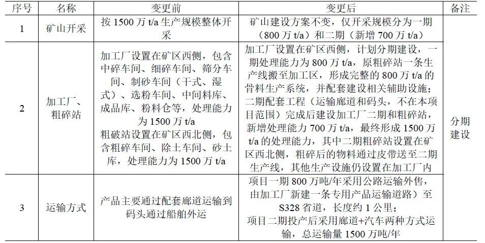 粗碎站建設、運輸方式三個方面變化。由整體開采改為分期建設,開采規模分為一期(800萬t/a)和二期(新增700萬t/a),加工廠設置布局相應改變,運輸方式由廊道配合船運改為公路運輸+廊道運輸。具體內容如下表。