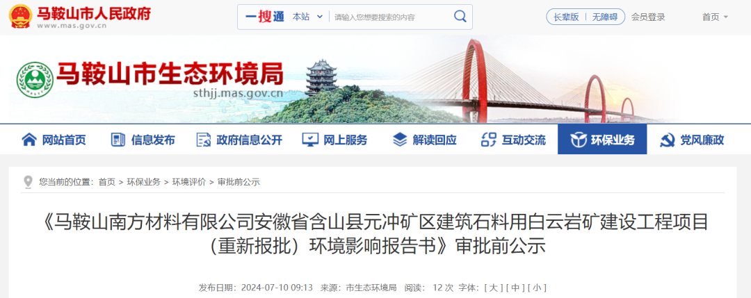 2024年7月10日,安徽省馬鞍山市生態環境局發布《馬鞍山南方材料有限公司安徽省含山縣元沖礦區建筑石料用白云巖礦建設工程項目(重新報批)環境影響報告書》審批前公示。