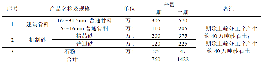 本項目主要產品為開采后加工的礦石原礦,一期建成后年產800萬噸綠色生態環保優質骨料,通過公路運輸進行外售;二期建成后年產1500萬噸綠色生態環保優質骨料,通過道路和廊道-碼頭進行外售。產品方案見下表。