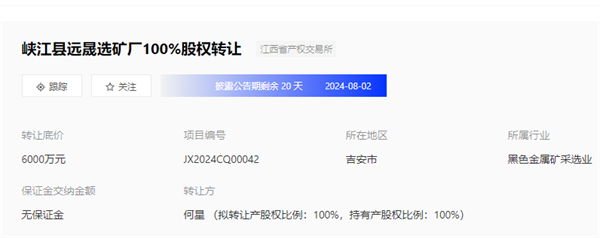 日前,據(jù)全國(guó)產(chǎn)權(quán)行業(yè)信息化綜合服務(wù)平臺(tái)披露,江西吉安峽江縣遠(yuǎn)晟選礦廠擬掛牌轉(zhuǎn)讓100%股權(quán),底價(jià)為6000萬(wàn)元。據(jù)悉,截至2023年12月31日,峽江縣遠(yuǎn)晟選礦廠營(yíng)業(yè)收入約70.37萬(wàn)元,凈利潤(rùn)約-2.21萬(wàn)元,資產(chǎn)總計(jì)約321.11萬(wàn)元,所有者權(quán)益約292.98萬(wàn)元。