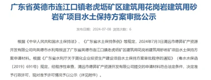 2024年7月8日,廣東清遠英德市水利局發布廣東英德連江口鎮老虎壢礦區建筑用花崗巖建筑用砂巖礦項目水土保持方案通過審批公告。該項目總投資5.64億元,設計總生產規模320萬方/年,施工工期6個月,建設單位為清遠市德昇礦產資源開發有限公司。