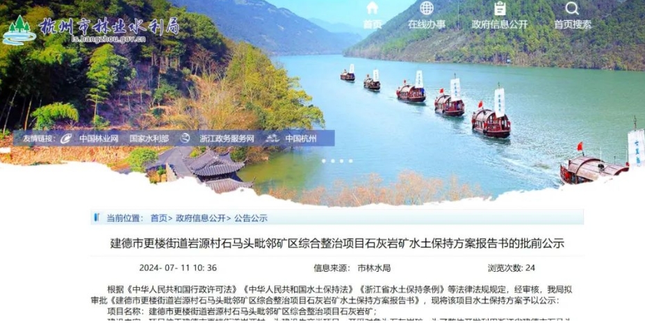 浙江杭州市林業水利局日前發布《建德市更樓街道巖源村石馬頭毗鄰礦區綜合整治項目石灰巖礦水土保持方案報告書的批前公示》。