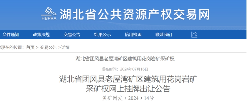 近日,湖北省團風縣老屋灣礦區建筑用花崗巖礦采礦權掛牌出讓,其開采礦種包含建筑用花崗巖、建筑用角閃巖、建設用砂(風化混合花崗巖),儲量共1.04億噸,生產規模500萬噸/年,出讓年限18.2年(含基建期1年),起始價1.73億元,拍賣單價約為1.66元/噸。