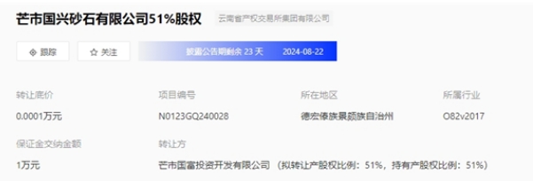 7月26日,據(jù)全國(guó)產(chǎn)權(quán)行業(yè)信息化綜合服務(wù)平臺(tái)披露,云南省德宏傣族景頗族自治州芒市國(guó)資委全資子公司——芒市國(guó)富投資開發(fā)有限公司掛牌轉(zhuǎn)讓旗下砂石公司51%股權(quán),轉(zhuǎn)讓底價(jià)0.0001萬(wàn)元(即1元),信息披露起止時(shí)間為2024年7月26日至2024年8月22日。