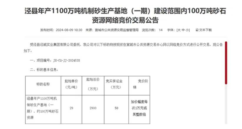 8月9日,安徽省宣城市公共資源交易監(jiān)督管理局發(fā)布公告稱,涇縣年產(chǎn)1100萬噸機(jī)制砂生產(chǎn)基地(一期)建設(shè)范圍內(nèi)100萬噸砂石資源以網(wǎng)絡(luò)競(jìng)價(jià)方式進(jìn)行公開交易。標(biāo)的起拍單價(jià)為29元/噸,起拍總價(jià)2900萬元,保證金50萬元。