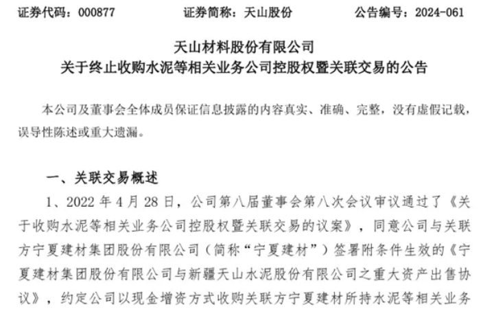 及至2024年8月9日,天山股份發(fā)布終止交易的公告,并表示本次交易的終止,是綜合考慮內(nèi)外部因素后,經(jīng)公司審慎研究并與各方友好協(xié)商后的決定,不存在公司及相關(guān)方需承擔相關(guān)違約責任的情形。目前公司生產(chǎn)經(jīng)營情況正常,本次交易事項的終止不會對公司正常經(jīng)營造成重大不利影響,不存在損害公司及全體股東,特別是中小股東利益的情形。