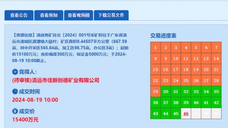 清遠(yuǎn)市佳新創(chuàng)德礦業(yè)有限公司以1.54億元競得該項(xiàng)目礦權(quán)。據(jù)悉,清遠(yuǎn)市佳新創(chuàng)德礦業(yè)有限公司成立于2024年7月23日,所屬行業(yè)為非金屬礦采選業(yè),經(jīng)營范圍許可項(xiàng)目包含非煤礦山礦產(chǎn)資源開采、港口經(jīng)營、道路貨物運(yùn)輸(不含危險(xiǎn)貨物)等。一般項(xiàng)目包含非金屬礦及制品銷售、礦物洗選加工、建筑用石加工、總質(zhì)量4.5噸及以下普通貨運(yùn)車輛道路貨物運(yùn)輸?shù)取?/div>