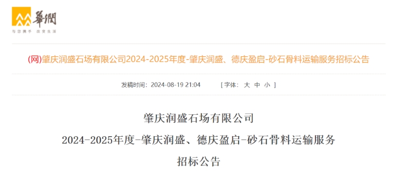 日前,華潤集團發(fā)布肇慶潤盛石場有限公司2024-2025年度-肇慶潤盛、德慶盈啟-砂石骨料運輸服務招標公告。招標人為肇慶潤盛石場有限公司,招標文件獲取時間為2024年08月19日-2024年08月26日,交貨期/工期1年。