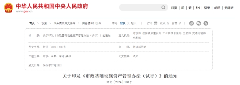 近日,財政部、住房城鄉(xiāng)建設(shè)部、工業(yè)和信息化部、公安部、交通運(yùn)輸部、水利部等六部門聯(lián)合印發(fā)《市政基礎(chǔ)設(shè)施資產(chǎn)管理辦法(試行)》,辦法自2024年9月1日起施行。