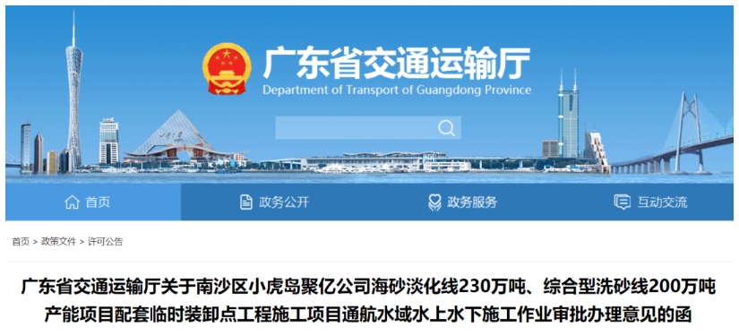 近日,廣東省交通運(yùn)輸廳發(fā)布《關(guān)于南沙區(qū)小虎島聚億公司海砂淡化線230萬噸、綜合型洗砂線200萬噸產(chǎn)能項目配套臨時裝卸點工程施工項目通航水域水上水下施工作業(yè)審批辦理意見的函》,根據(jù)文件內(nèi)容,原則同意施工方案提出的航道通航安全保障措施,施工作業(yè)應(yīng)全面落實提交的施工組織方案中的航道與通航安全保障措施,確保施工區(qū)域航道暢通。隨著項目的完成,大灣區(qū)將再添一處230萬噸海砂淡化項目。