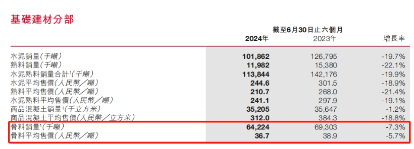 集團(tuán)基礎(chǔ)建材分部的收入由截至2023年6月30日止六個(gè)月的人民幣58748.3百萬元減少至截至2024年6月30日止六個(gè)月的人民幣40780.6百萬元,降幅為30.6% ,主要原因是水泥產(chǎn)品、骨料的銷量減少,以及水泥產(chǎn)品、商品混凝土和骨料的平均售價(jià)下降。