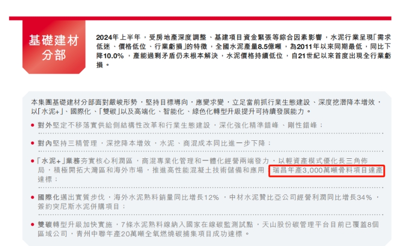 在骨料業(yè)務(wù)方面,上半年骨料銷量6422.4萬噸,相較2023年6930.3萬噸,下降7.3%。骨料平均售價(jià)為36.7元/噸,相較于2023年38.9元/噸,下降5.7%。值得關(guān)注的是,中國建材投資建設(shè)的瑞昌年產(chǎn)3000萬噸骨料項(xiàng)目達(dá)產(chǎn)達(dá)標(biāo)被重點(diǎn)計(jì)入本次半年報(bào)。