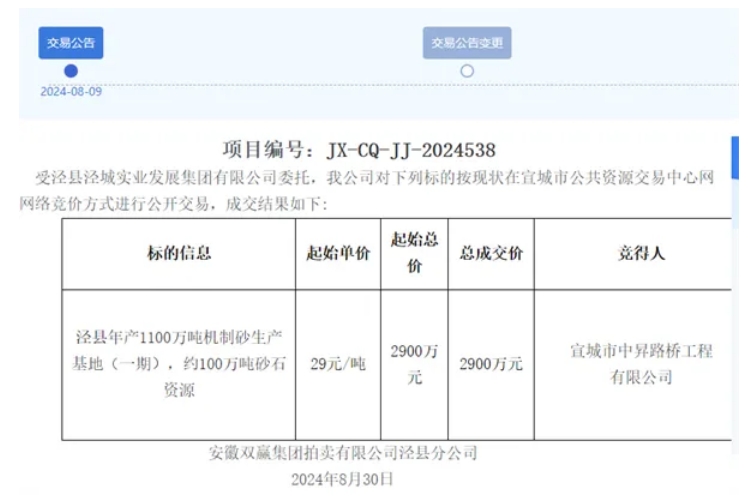 近日,安徽宣城市中昇路橋工程有限公司以2900萬(wàn)元競(jìng)得涇縣年產(chǎn)1100萬(wàn)噸機(jī)制砂生產(chǎn)基地(一期),約100萬(wàn)噸砂石資源,單價(jià)29元/噸。