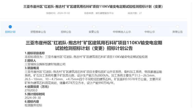 近日,海南省公共資源交易平臺(tái)發(fā)布三亞市崖州區(qū)“紅巖隊(duì)-抱古村”礦區(qū)建筑用石料礦項(xiàng)目110KV輸變電定期試驗(yàn)檢測招標(biāo)計(jì)劃(變更)招標(biāo)計(jì)劃公告。