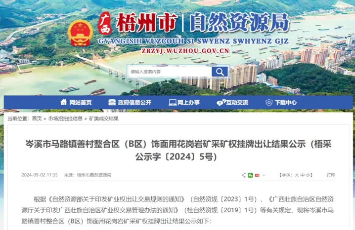 9月2日,據(jù)梧州市自然資源局官網(wǎng)公示,廣西瑞誠礦業(yè)有限公司底價3.52億元成功競得廣西壯族自治區(qū)岑溪市馬路鎮(zhèn)善村整合區(qū)(B區(qū))飾面用花崗巖礦采礦權(quán)。該礦資源儲量超1.1億噸,擬出讓年限24.2年(含基建期2年),年產(chǎn)規(guī)模近330萬方。