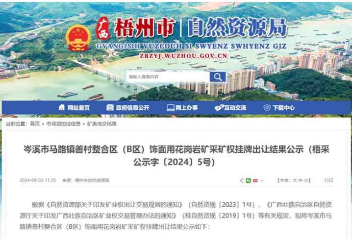 9月2日,據(jù)梧州市自然資源局官網(wǎng)公示,廣西瑞誠礦業(yè)有限公司底價(jià)3.52億元成功競得廣西壯族自治區(qū)岑溪市馬路鎮(zhèn)善村整合區(qū)(B區(qū))飾面用花崗巖礦采礦權(quán)。該礦資源儲(chǔ)量超1.1億噸,擬出讓年限24.2年(含基建期2年),年產(chǎn)規(guī)模近330萬方。