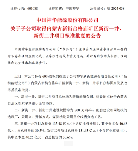 9月3日晚,中國神華(601088)公告稱,近日,本公司持有60%股權(quán)的控股子公司新街能源公司內(nèi)蒙古新街臺(tái)格廟礦區(qū)新街一井、新街二井項(xiàng)目獲得國家發(fā)展改革委核準(zhǔn)批復(fù)。新街一井、新街二井項(xiàng)目建設(shè)規(guī)模均為800萬噸/年,總投資265.11億元。