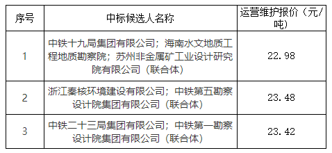 該項目資源儲量4991.5萬方,設(shè)計產(chǎn)能675萬噸/年,中鐵十九局集團、海南水文地質(zhì)工程地質(zhì)勘察院、蘇州中材非金屬礦工業(yè)設(shè)計研究院(聯(lián)合體)運營維護報價22.98元/噸入選,位于候選人第一。