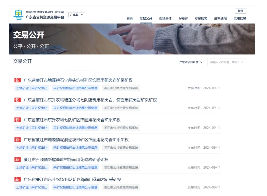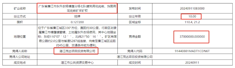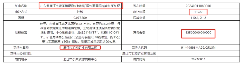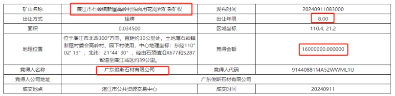近日,廣東省湛江市公共資源交易中心發(fā)布六宗花崗巖礦采礦權(quán)出讓結(jié)果,六宗花崗巖礦山資源量共計超3670萬方,成交額超51470萬元。其中廣東省廉江市東升農(nóng)場七隊礦區(qū)飾面用花崗巖礦采礦權(quán)被廉江市石嶺強大石場有限公司以2.542億元競得,是六宗礦權(quán)中最大的一宗。