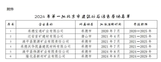 據(jù)悉,該基地主要是保障北京市建設(shè)工程建材供應(yīng),是經(jīng)承德市人民政府推薦、相關(guān)部門和單位研究并報(bào)請(qǐng)市政府同意,確認(rèn)承德寶通礦業(yè)有限公司、遷安首礦建材有限公司、灤平縣聚源礦業(yè)有限責(zé)任公司、承德沃華筑嘉建筑材料有限公司、灤平縣偉源礦業(yè)有限責(zé)任公司、隆化縣新村礦業(yè)有限公司為“北京市建筑砂石綠色基地”。