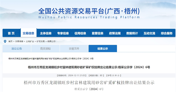 近日,廣西梧州市國土資源交易中心發(fā)布萬秀區(qū)龍湖鎮(zhèn)旺步村富林建筑用砂巖礦采礦權(quán)掛牌出讓結(jié)果。該項(xiàng)目總資源儲(chǔ)量2.74億噸,年生產(chǎn)規(guī)模900萬噸,出讓年限19年,掛牌起始價(jià)4.3億元。梧州市福森林業(yè)投資建設(shè)有限公司歷經(jīng)多輪競(jìng)拍,以7.24億元競(jìng)得。經(jīng)計(jì)算,該項(xiàng)目噸成本約2.64元。