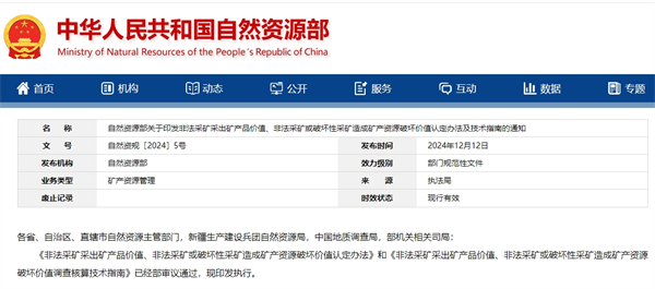 12月12日,自然資源部公開發(fā)布《非法采礦采出礦產(chǎn)品價值、非法采礦或破壞性采礦造成礦產(chǎn)資源破壞價值認定辦法》(下稱《認定辦法》)和《非法采礦采出礦產(chǎn)品價值、非法采礦或破壞性采礦造成礦產(chǎn)資源破壞價值調(diào)查核算技術(shù)指南》(下稱《技術(shù)指南》),并印發(fā)執(zhí)行。
