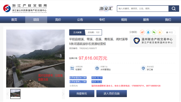 根據(jù)公告,該項(xiàng)目報(bào)名時(shí)間為2024年12月17至2024年12月23日下午5時(shí)止。成交后,競(jìng)得人需在競(jìng)價(jià)成交之日起60個(gè)工作日內(nèi)一次性支付全部費(fèi)用,具體以《平陽(yáng)縣順溪、帶溪、岳溪、青街溪、鬧村溪等5條河道疏浚砂石資源經(jīng)營(yíng)權(quán)轉(zhuǎn)讓合同》約定為準(zhǔn)。